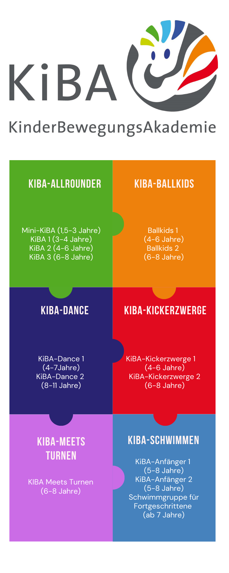 Ähnlich wie bei den Ballkids, die den Schwerpunkt auf Ballsport legen oder den Kickerzwergen mit Schwerpunkt Fußball, legt „KiBA meets Turnen“ den Schwerpunkt auf das Erlernen von turnerischen Grundlagen am Gerät (Schwebebalken, Boden, Reck, Sprung (Trampolin/Sprungbrett), Ringe und Seile).